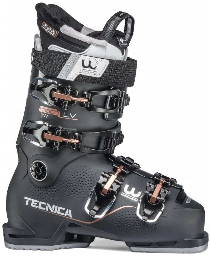 De Tecnica Mach1 95 LV Women is een skischoen met een laag volume, geschikt voor smalle voeten of voor skiers die op zoek zijn naar een strakke fit.